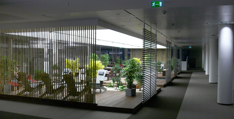 Japanischer Garten, Kernbereich Die Gärten als Querriegel bieten einerseits eine Abgrenzung, andererseits verbinden sie die beiden Arbeitsplatzbereiche. Zwischen den Gärten sind Holzpodeste eingeschoben, die für kurzen Rückzug, für die kleine Pause zwischendurch oder für ein "zu Sinnen kommen" genutzt werden können. Ein wenig transparente Distanz zu den Arbeitsplätzen schaffen offene Lamellenwände. So kann Licht und Luft durchdringen und trotzdem etwas Schutz geboten werden. Der Bereich zu den Verkehrswegen wird dichter abgegrenzt. Hier bilden vertikale Bambusstäbe, mit Licht in Szene gesetzt, einen direkten Verweis auf die dahinterliegende Nutzung. Über dem Japanischen Garten ist eine Lichtdecke angeordnet: Für tageslichtähnliches Licht, das den Mittelbereich des Großraums gleichzeitig effektvoll in Szene setzt. Die positive Stimmung wirkt sich auf die ganze Etage aus, wird doch, der bisher dunkle Bereich genau ins Gegenteil verkehrt. Die Beete und Wasserbecken sind in Wannen auf den Rohfußboden gesetzt. Durch die zusätzliche Erhöhung der Holzterrassen entsteht so eine dreidimensionale Wasser- und Pflanzenlandschaft. |